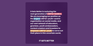 Pride Noun. The celebration of LGBTQ+ identities, and of the global LGBTQ+ community’s resistance against discrimination and violence. Meet the It Gets Better Pride Street Teams From Hawaii, With Joy LGBTQ+ Youth Are Counting On Us. We Won’t Back Down! Rain or Shine – An Unforgettable Pride Youth Voices: What Pride Means to Us It Gets Better in USA Today Pride Month Issue Pride Village – Part of A Digital Pride Experiance The Brands Standing With LGBTQ+ Youth in 2024 Celebrating a Decade of Empowerment To Be Jewish and Queer “Queerbook” is Available Now Partner With It Gets Better Making Things Better in LatAm: It Gets Better at ILGA LAC’s Regional Conference in Bolivia! Changing Schools, One Student at a Time Just keep Riding (for Queer Youth in Taiwan)! It Gets Better Canada Launches Mental Health Hub Queerbook 2024 Calle y Poché, mxmtoon, TX Pride, Buzz Lightyear | Perfectly Queer with the It Gets Better Project Pride | LGBTQ+ Fundamentals FFXIV and what the game means to us! | Spofie and Guests | Digital Pride 2023 Actors and Performers: mxmtoon and Voice Actors Panel! | Digital Pride 2023 Olivia Julianna | Your purpose comes from all the things you’re going through | It Gets Better “If Students Don’t Feel Safe, They Can’t Learn” Thank You! We Couldn’t Do This Without You! LGBTQ+ Career Day It Gets Better: Olivia Julianna Conversations That Inspire in São Paulo Why I’m Not Worried This Pride Month These Are the Brands Supporting LGBTQ+ Youth You Can’t Legislate Our Happiness Digital Pride Spring 2023: Spitfire Spring 2023: Reflection AAPI& The It Gets Better Project Premieres New Web-Series “The Assignment,” Focusing on Career Readiness in Culinary Industry for LGBTQ+ Youth It Gets Better Global Summit We Were There, And We Were Loud It’s Time To Celebrate Black, Queer Voices Pride Flag Flies 365 at THIS School The Brands That Backed LGBTQ+ Youth in 2022 Reflections on Pride | Youth Voice Zine Issue 003 Meet the Brands Supporting LGBTQ+ Youth Digital Pride is Back! Never be afraid to say “GAY!” Youth Voices: We Made a Zine! 50 States. 50 Grants. 5000 Voices. Queer History Heroes You Need to Know LGBTQ+ Comic Book Heroes! Better Pride 2021 YOUTH VOICES