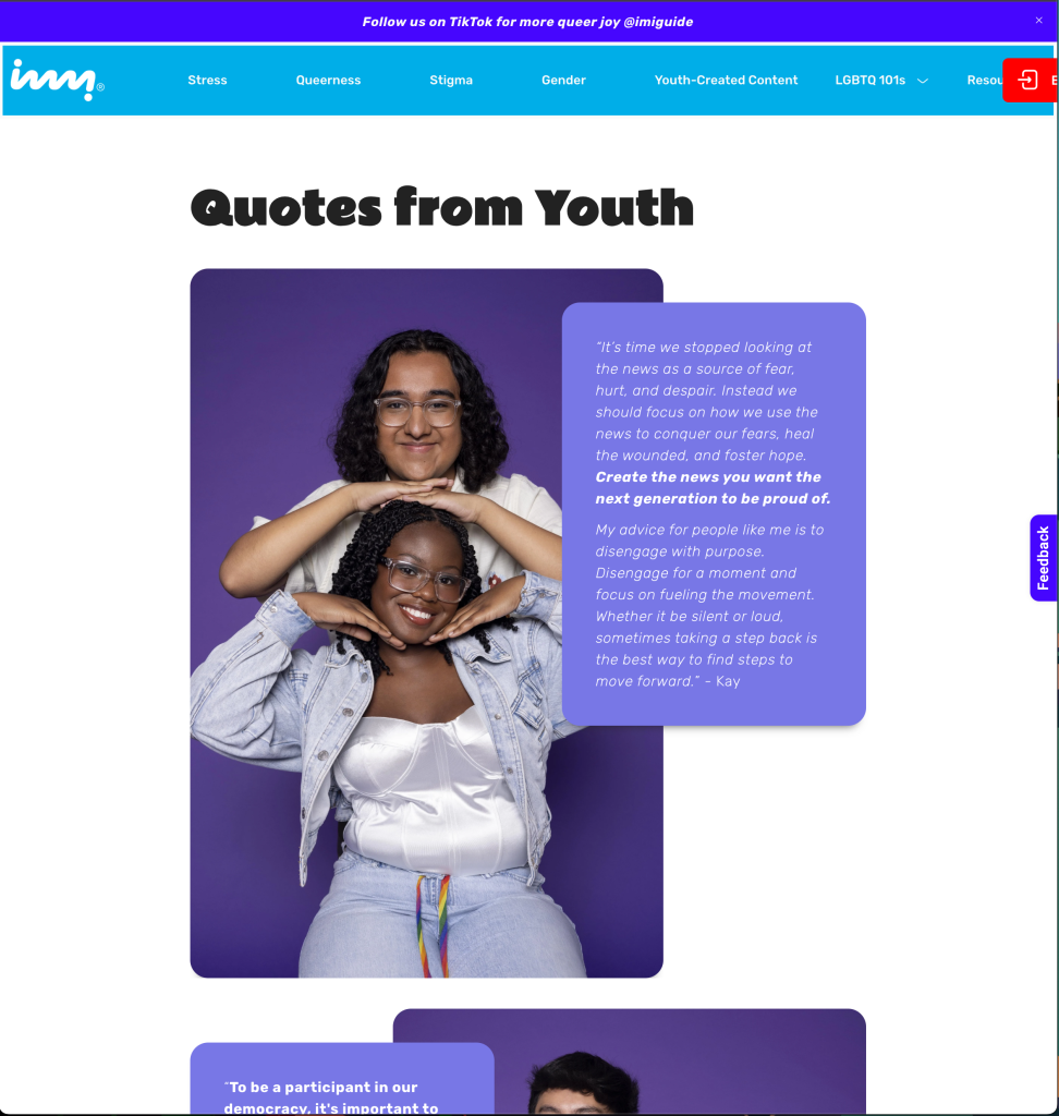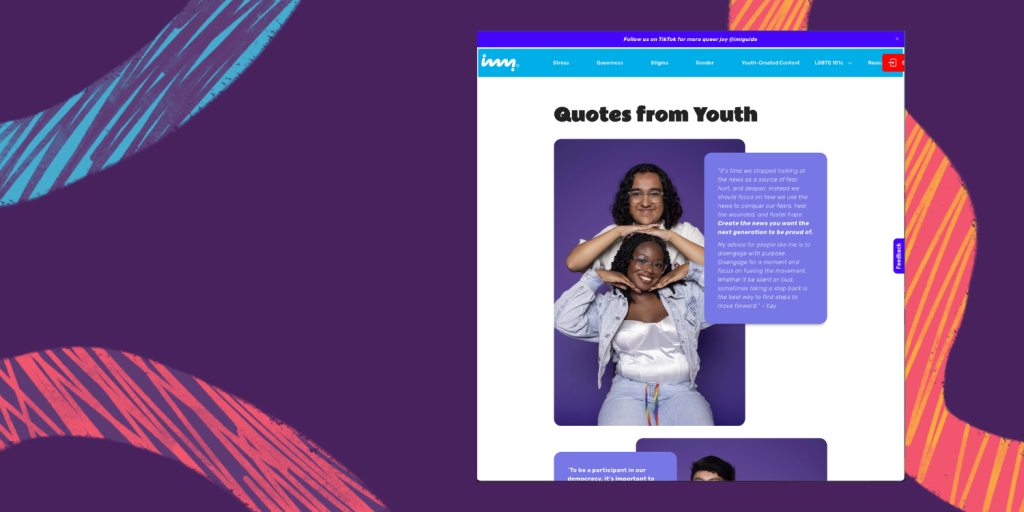 That’s why resources like How to Deal with the News are so important. This is a new module for imi (eye-me), our free digital mental health resource for LGBTQ+ youth that has helped nearly 230,000 users over the last few years. It was created by our Youth Voices ambassadors, who are living this reality in real time.