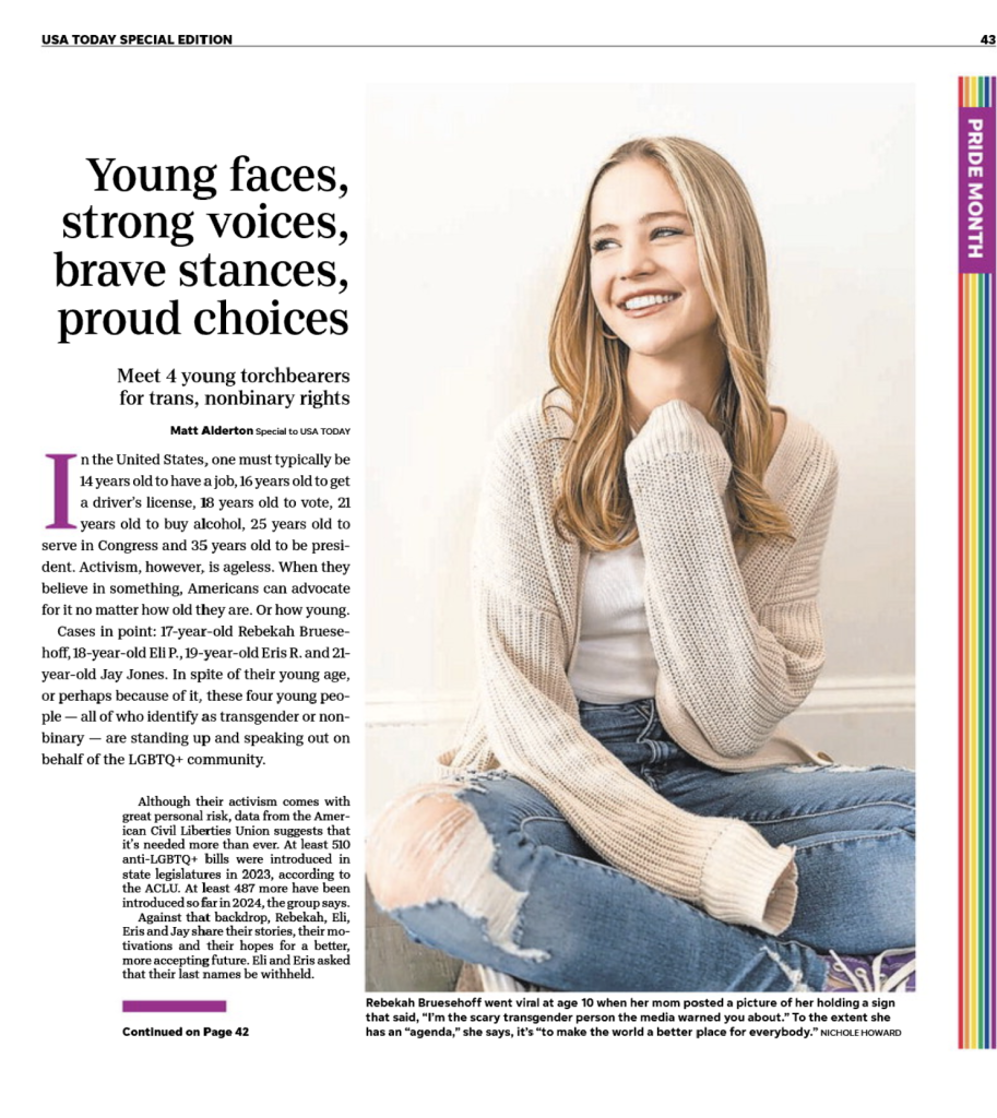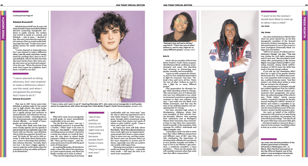 The piece is a spotlight on four trans and non-binary young activists who are using their platforms to make things better for their peers. Eli and Eris are both members of the 2023-2024 class of youth ambassadors and told USA Today that working with It Gets Better helped them find their voices.