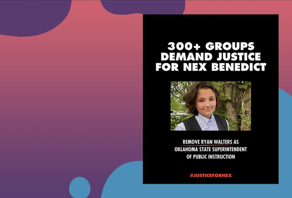 “Superintendent Walters appears to have no interest in the safety and future of Oklahoma’s students as he has dangerously and recklessly prioritized escalating attacks against LGBTQ, indigenous, and vulnerable youth, promoting lies, spreading disinformation, and pushing broad scale discriminatory policies that do nothing to improve education. He has policed LGBTQ and affirming educators and pushed forward draconian rhetoric and policies to erase the culture and history of entire communities of Oklahomans. He is on the record using taxpayer funds to fuel his extremist agenda, in alignment with national anti-LGBTQ groups like Moms for Liberty and extremists on social media. Removing Walters would be one measure of justice for Nex Benedict and every other young Oklahoman, and a small step toward ensuring a new era in Oklahoma schools where every young person should be safe, protected and belong.”